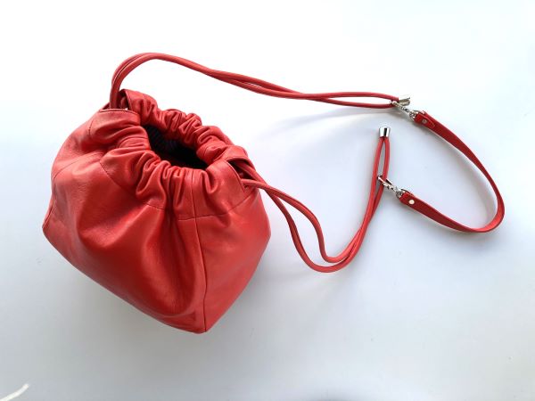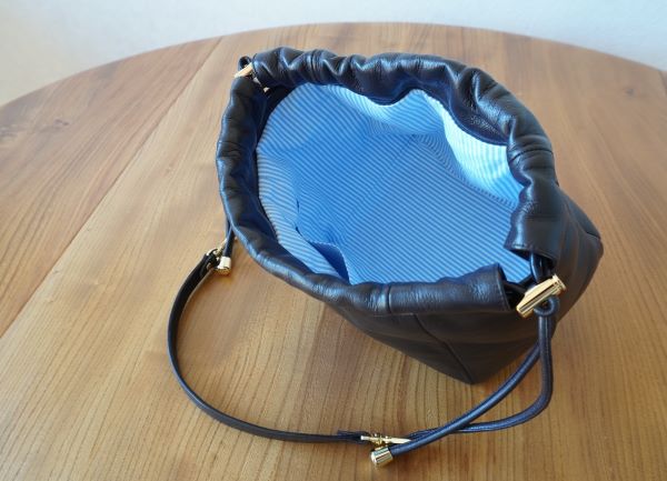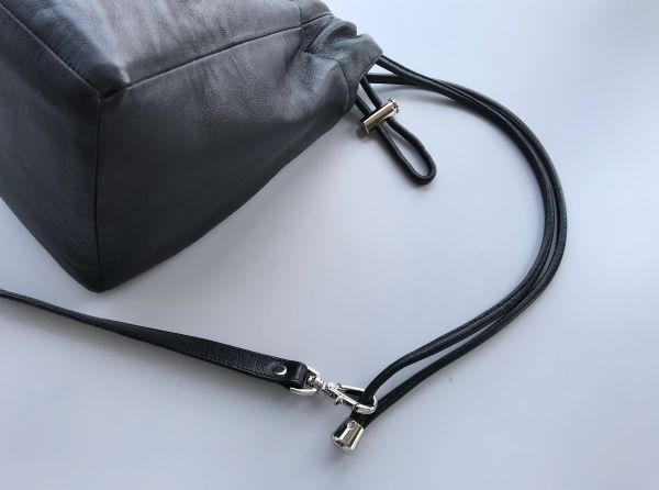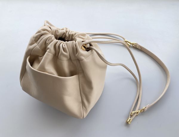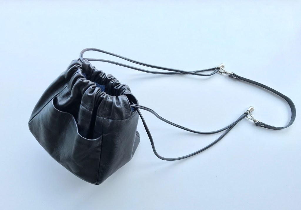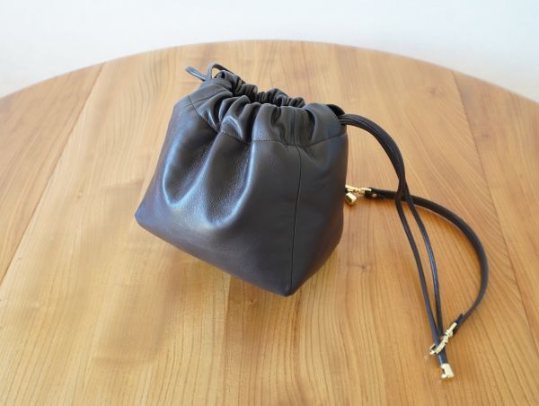 柔らかなイタリア産シープ革で仕上げた巾着バッグです。ストリングを肩にかけるだけでなく、付属のストラップをエクステンションとして使えば斜めがけポシェットに。ストリングに取り付けた絞り金具を使ってお好みの長さに変えられます。高さ約20cm,横約20cm,マチ約15cm。※独自の計測方法の数値です