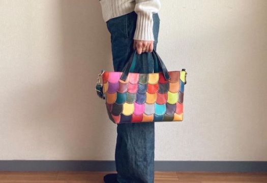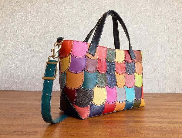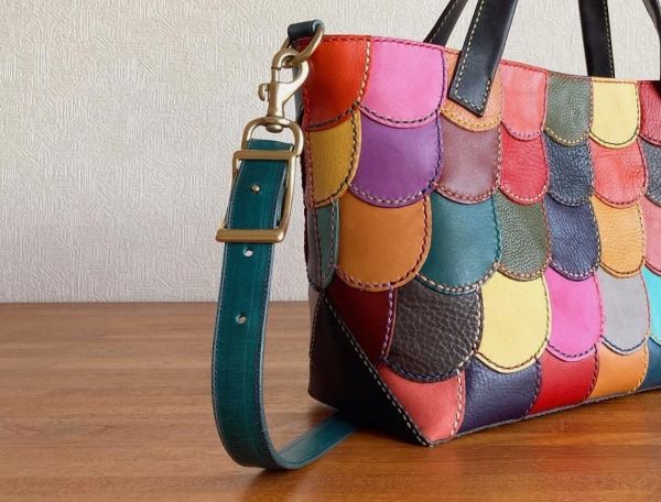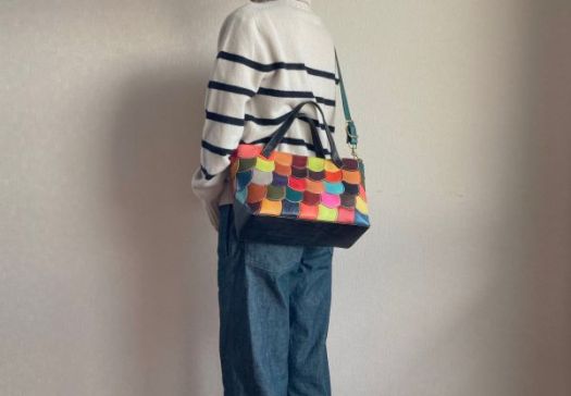 半円状の革で手縫いのパッチワークを全面に施したトートバッグです。ひとピースごとに革と糸の色を変えて仕上げています。