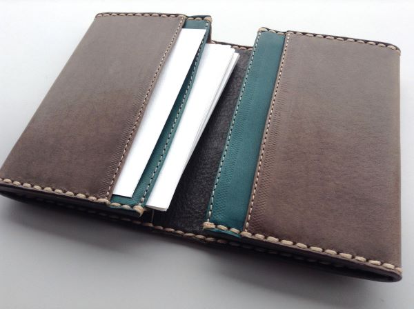 見開き両面のカードケースです。それぞれのポケットに仕分けの仕切りを付けてあります。