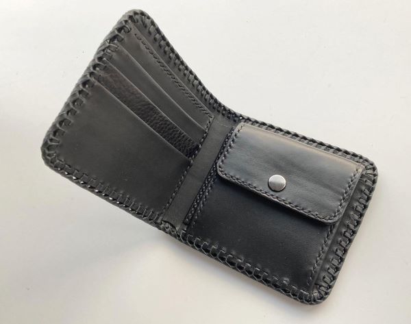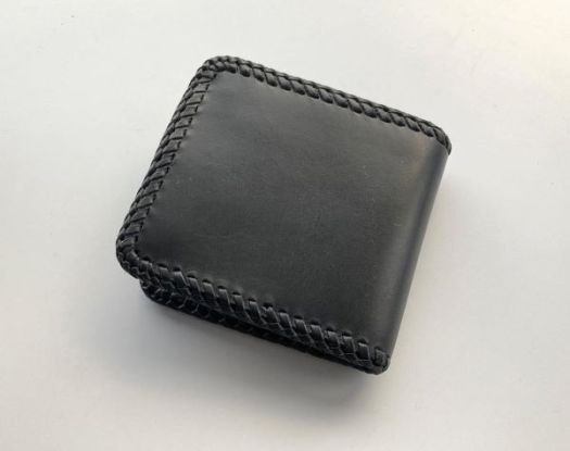 千葉県市川市で注文靴屋と靴作り教室を運営するスタジオmmkのHPです。このページではオリジナル革小物の「二つ折り財布01レースかがり」をご紹介しています