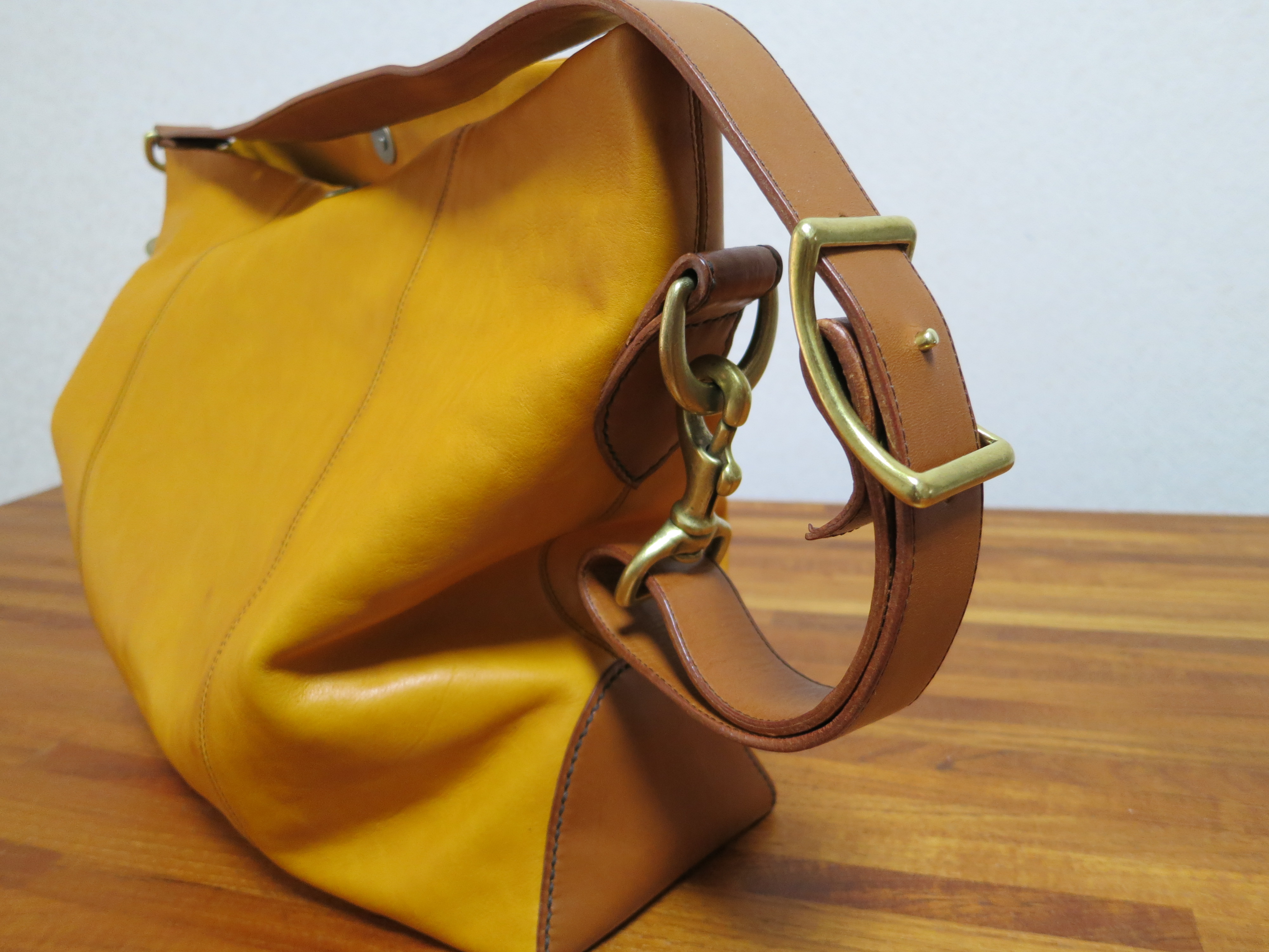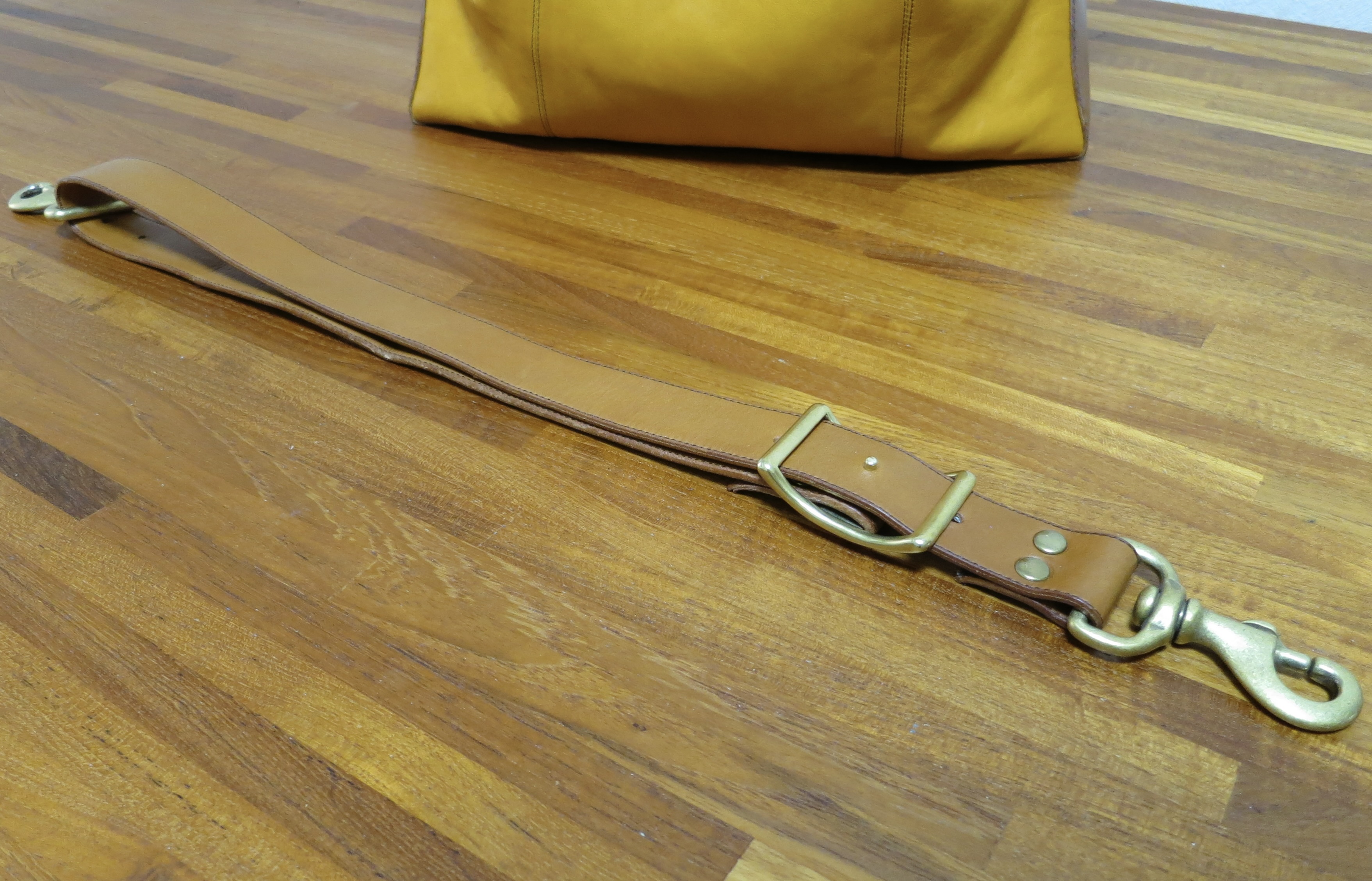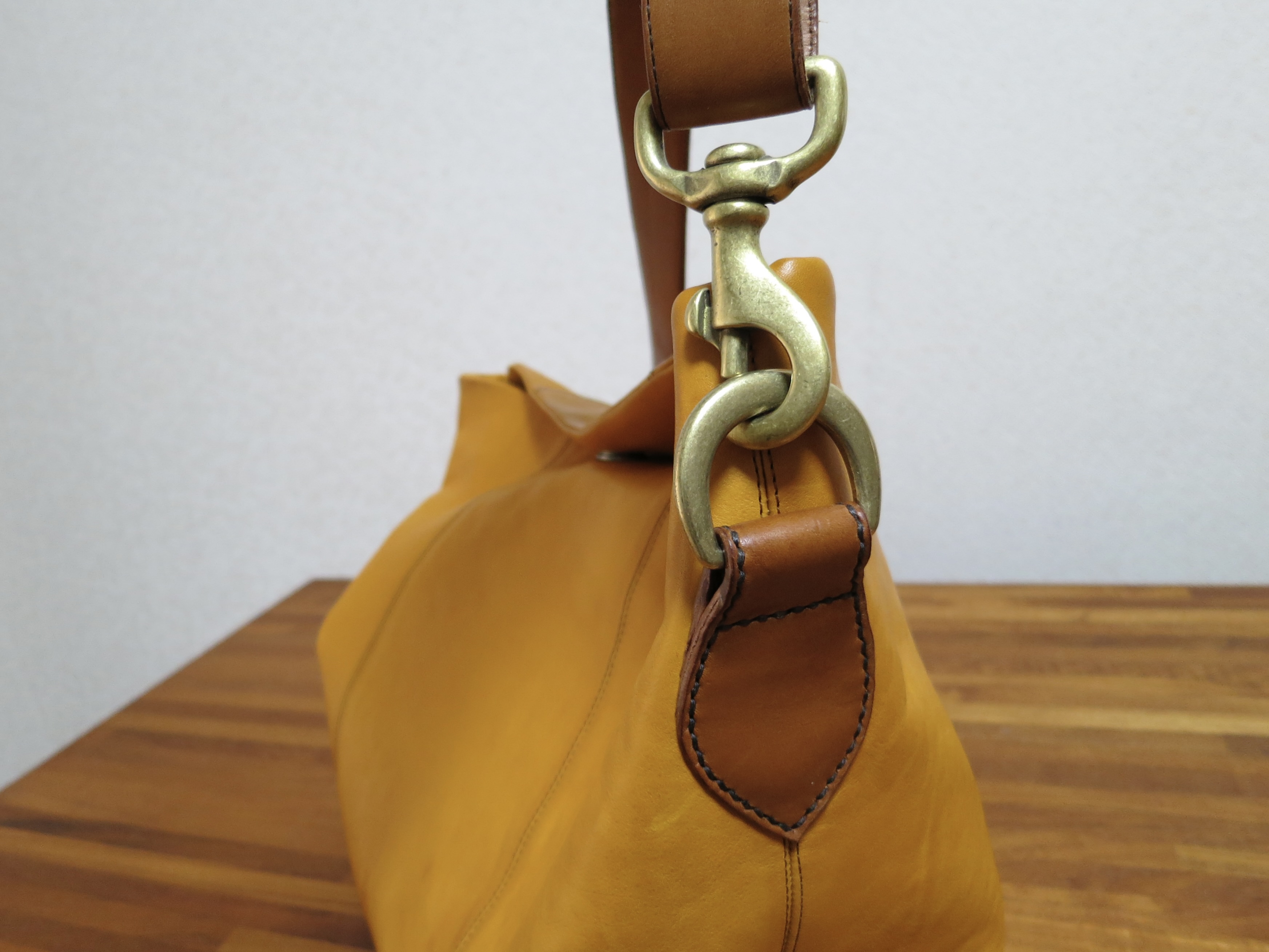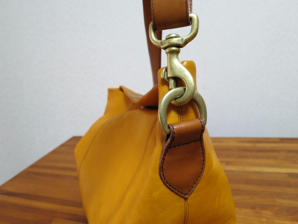 ベルトに付けたナスカンを鞄本体につけたカンに取り付けて使用します。大きめの金具を使用することで鞄全体のアクセントにもなっています。
