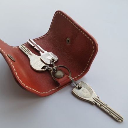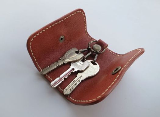 イタリア製タンニンなめしのシボ革を使ってキーケースを作ります。裁断してある革に穴をあけ、