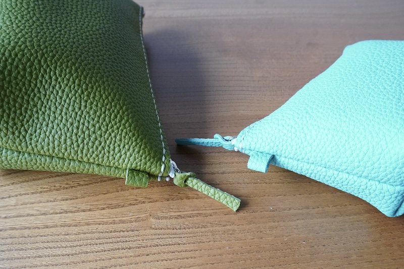 イタリア製タンニンなめし革を使ってファスナーポーチを作ります。裁断してある革に穴をあけ、お好きな色の糸で手縫をします。