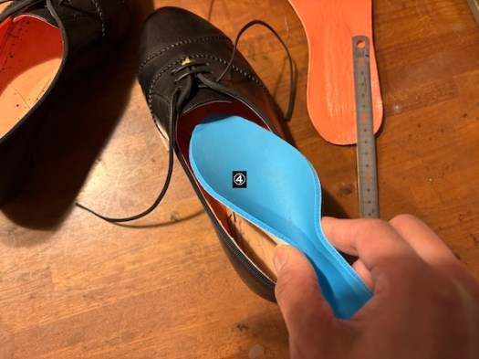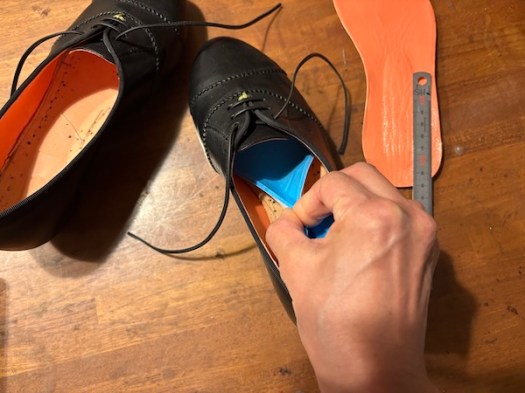 ④ならびに外した中敷を戻す際には写真のように中敷を少し半分に折るように持って一旦中敷の先端を靴の一番奥に入れてから