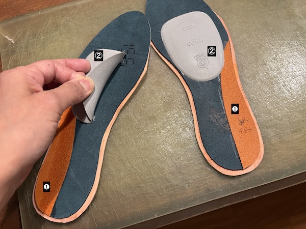 ③は場所の変更が出ないものなので中敷革と土台の革の間に挟んで固定してあります。