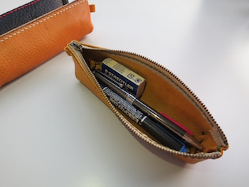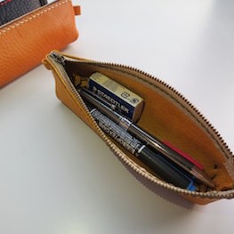 コンパクトサイズながらも袋仕立てでつくるためたっぷり入り、ペン5.6本と消しゴムを一緒に入れてもすっきり収まる作りです。