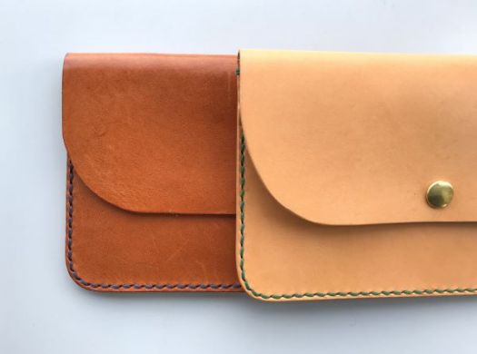 裁断してある革に穴をあけ、手縫いをし、ワックスで革磨きをして頂きます。