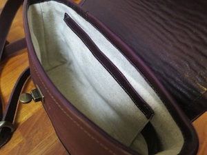 裏地には携帯電話やパスケースなどを入れられる平面ポケットを一つ