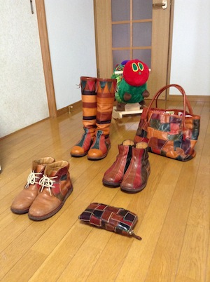 茶色の持ち手と底面で『森バッグ』とか、青系の革のピースで『ヘビバッグ』、