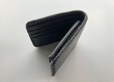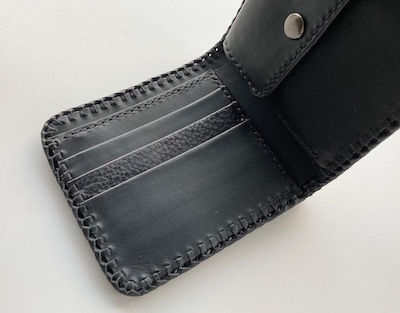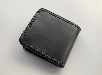 一般的な二つ折り財布ですが、革のレース糸で仕上げるレースかがり仕上げ。