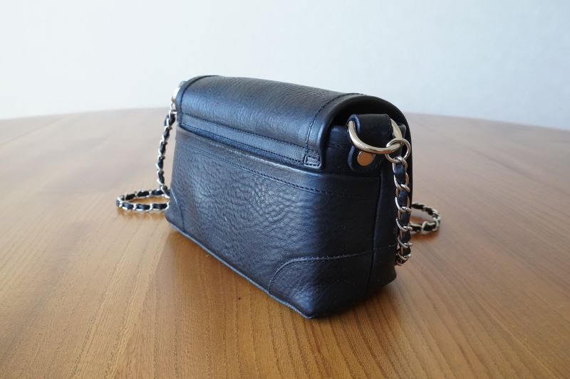 チェーンには本体と同じ革(もしくは同等クラスの革)を用いて作った三つ折りテープを通しています。