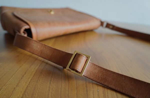斜め掛けベルトはバックルで微調整できるようになっています。ベルトを短く絞ると肩掛けバッグとしても使えて便利です。
