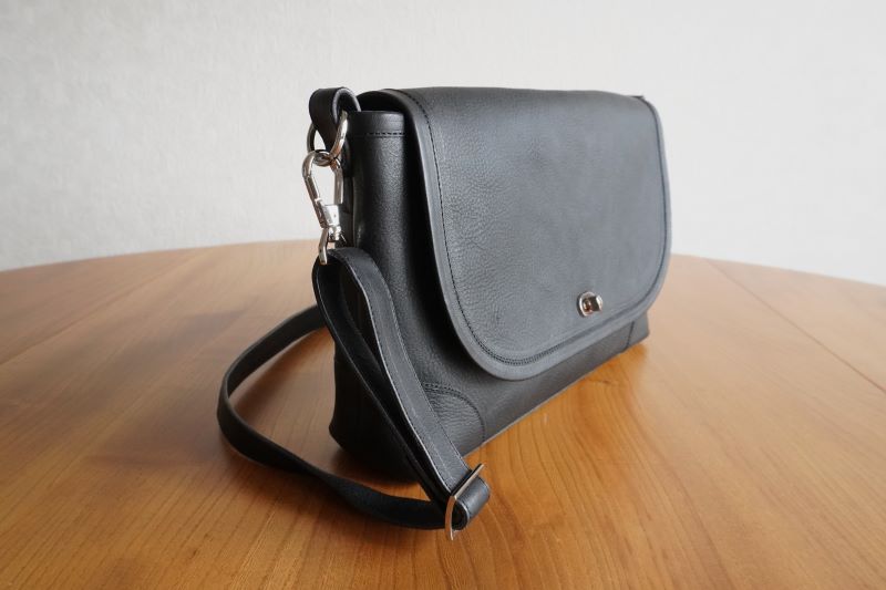 お財布やメガネケースなどのデイリーアイテムやA5サイズのものがちょうどよく入る収納力ですが、すっきりとしたサイズに仕上がっています。