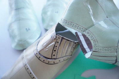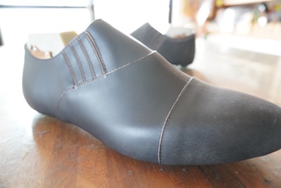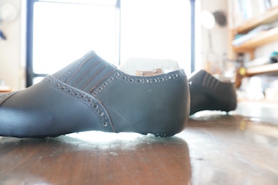 裏革も付けるし、芯材も入れます。実際に歩くので仮の底材も付けて