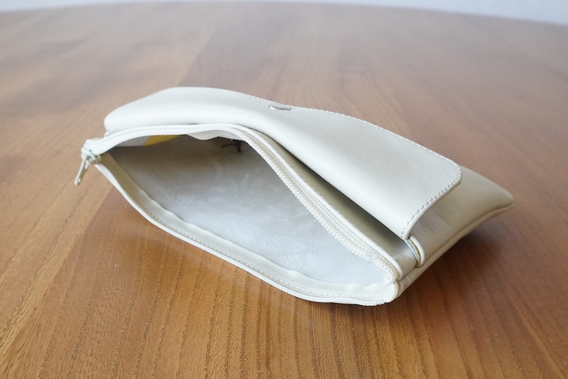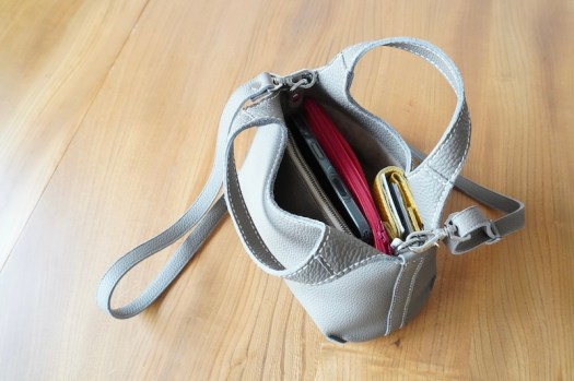 使用例ではポーチ二つ、スマートフォン、三つ折り財布を入れています。袋口は狭いですが袋部は小ぶりながらも必要なものがしっかり収まる容量です。