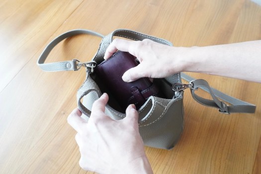 長財布は斜めに入れ込みながら収納するとおさまりますが出し入れの際に袋口に手が当たってしまいます。