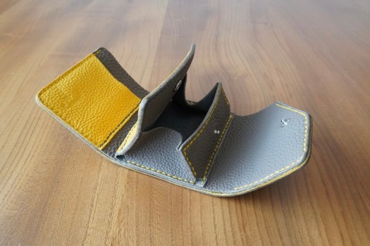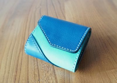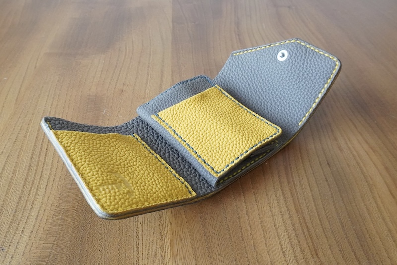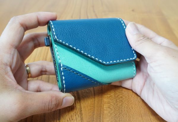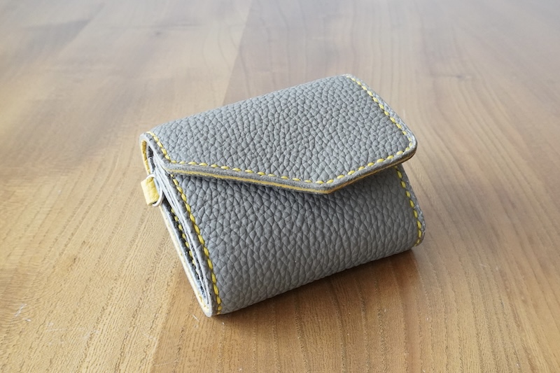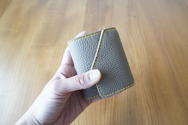 センターのカードポケットがコインケースの蓋になる構造で、三つ折りにたたむと手のひらに収まるコンパクトさ。折りたたんだ時に約8㎝×約9㎝ほどの手のひらサイズです。