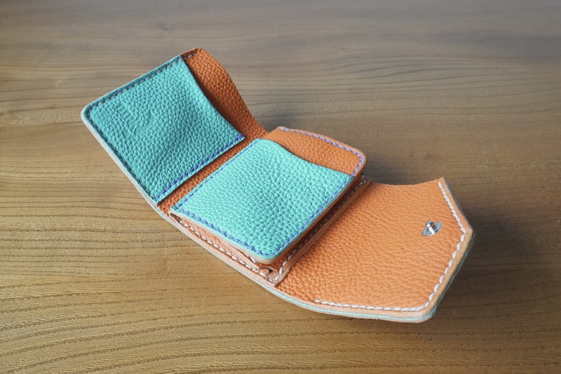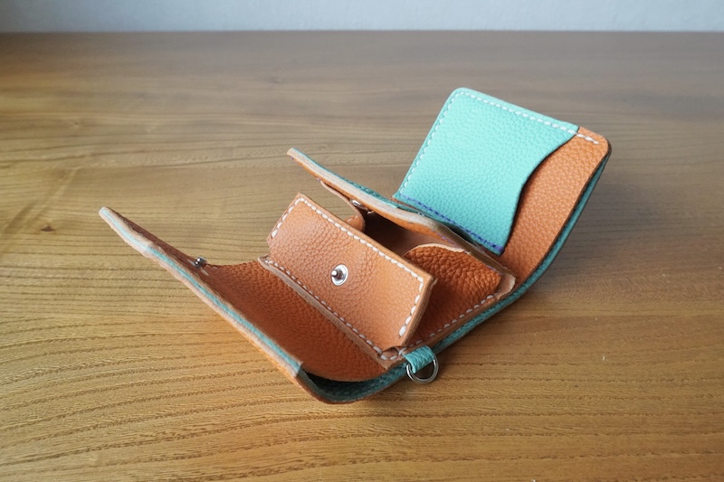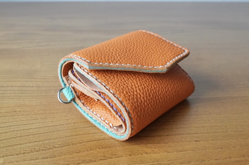 センターのカードポケットがコインケースの蓋になる構造で、三つ折りにたたむと手のひらに収まるコンパクトなお財布です。